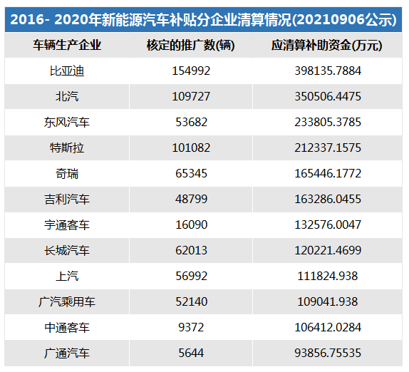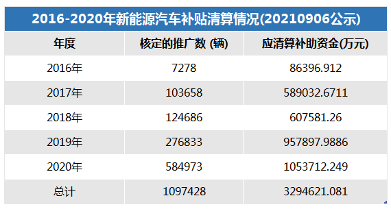 2021年9月6日,工業(yè)和信息化部發(fā)布了《關(guān)于2016-2020年度新能源汽車推廣應(yīng)用補(bǔ)助資金清算審核初審情況的公示》。公示信息顯示,2016-2020年完成銷售上牌的109.74萬(wàn)輛新能源汽車,應(yīng)清算補(bǔ)貼資金329.46億元。