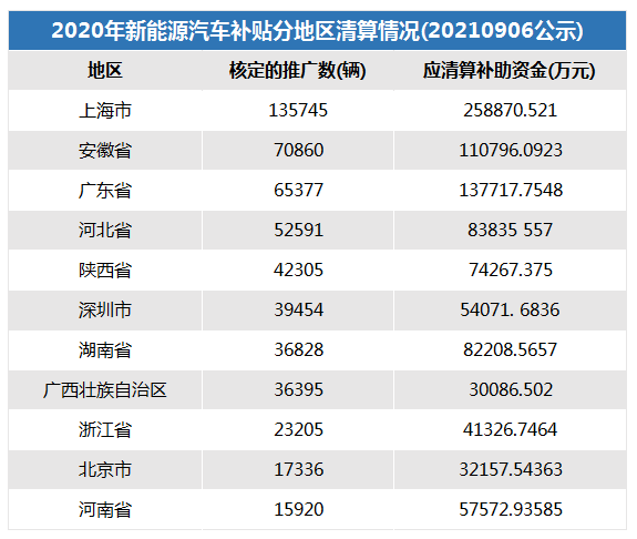 從核準(zhǔn)的車輛數(shù)來(lái)看,上海市是本次清算2020年的補(bǔ)貼資金中車輛數(shù)最多的地區(qū),核準(zhǔn)了13.6萬(wàn)輛,幾乎是核定車輛數(shù)第二名安徽省的兩倍。