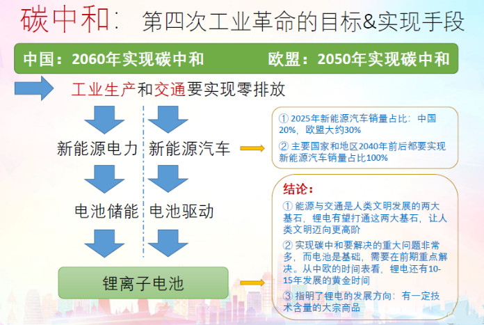 碳達(dá)峰、碳中和、凈零排放、氣候中和,是各國應(yīng)對氣候變化的不同階段目標(biāo)。2021年,是中國碳中和元年,在未來的30-40年里,碳中和將是社會(huì)經(jīng)濟(jì)發(fā)展的主基調(diào)。鋰電池行業(yè)及產(chǎn)業(yè)鏈企業(yè)勢必乘風(fēng)破浪,蓄勢待發(fā)。